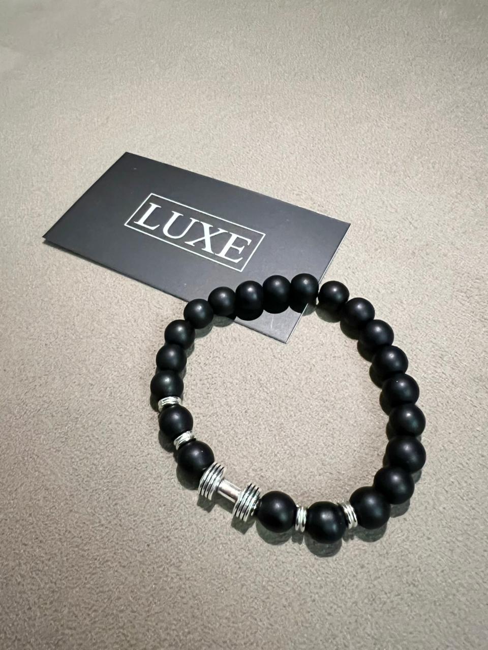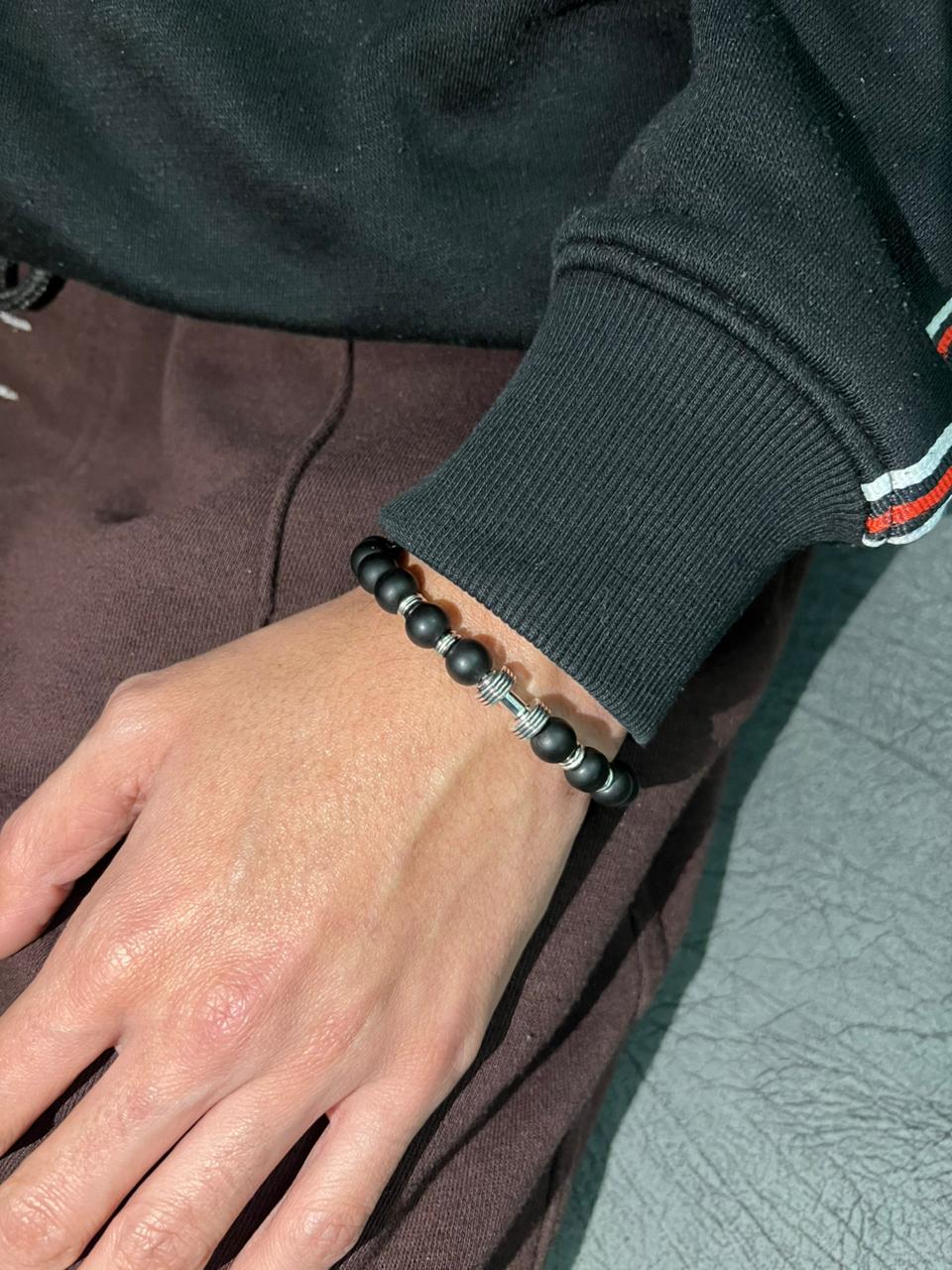 This matte black beaded bracelet features a bold silver dumbbell for a sharp, modern look. Built for everyday wear, easy to style, and made to last.